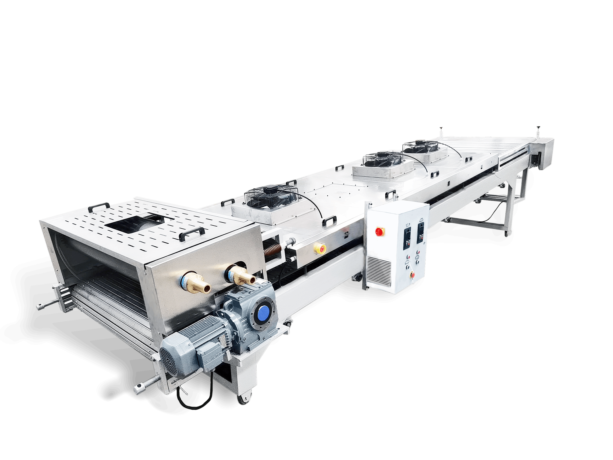 YPJ系列不銹鋼鏈板壓片機由冷卻壓輥、不銹鋼節片輸送帶、破碎和風冷系統組成。擠出機擠出的熱熔融狀物料經冷卻壓輥壓成 1-2mm 片狀,在不銹鋼節片輸送帶上風冷至常溫,破碎成片狀物料排出。可選配有空氣過濾,冷熱交換系統。